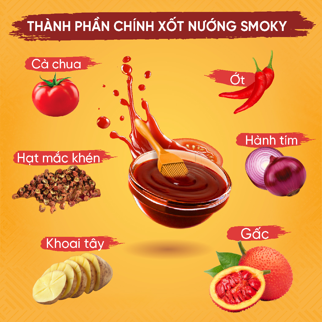 Công nghệ ám khói: Xốt Nướng Mắc Khén Smoky sử dụng công nghệ hiện đại để ám khói trực tiếp vào hỗn hợp gia vị, tạo ra hương khói tự nhiên như khi nướng trên lửa than thông thường. Công nghệ này giữ nguyên hương vị khói đậm đà trong mỗi muỗng Xốt, giúp món nướng trở nên quyến rũ mà vẫn an toàn và tiện lợi.