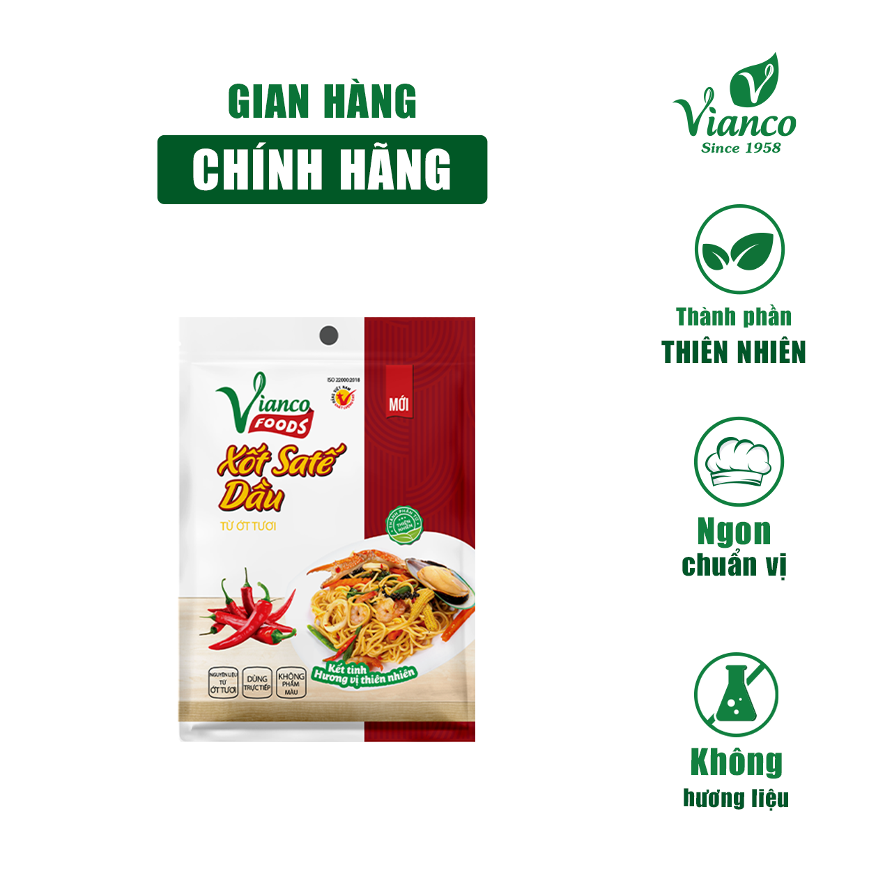 Mua tại TiktokXốt sa tế dầu ViancoFoods Việt Ấn là sản phẩm được ưa chuộng với thành phần nguyên liệu tươi, hoàn toàn từ thiên nhiên. Đặc biệt xốt sa tế dầu ViancoFoods có đầy đủ các nguyên liệu cần thiết. Từ tỏi, sả, ớt, tôm thêm các nguyên liệu đặc biệt như mè, đậu phộng mang đến hương vị thơm ngon cho mọi món ăn. Có thể thêm vào món nước, món chiên, làm món nướng đến chấm với đồ luộc, … đều ngon. Đây cũng là một sản phẩm với công thức hương vị truyền thống lưu truyền 63 năm từ Vianco. Rất hợp khi “đi đôi” cùng các loại gia vị bán hoàn chỉnh phở bò, bò kho, bún bò cho các món Việt này. KẾT TINH 100% NGUYÊN LIỆU THIÊN NHIÊN