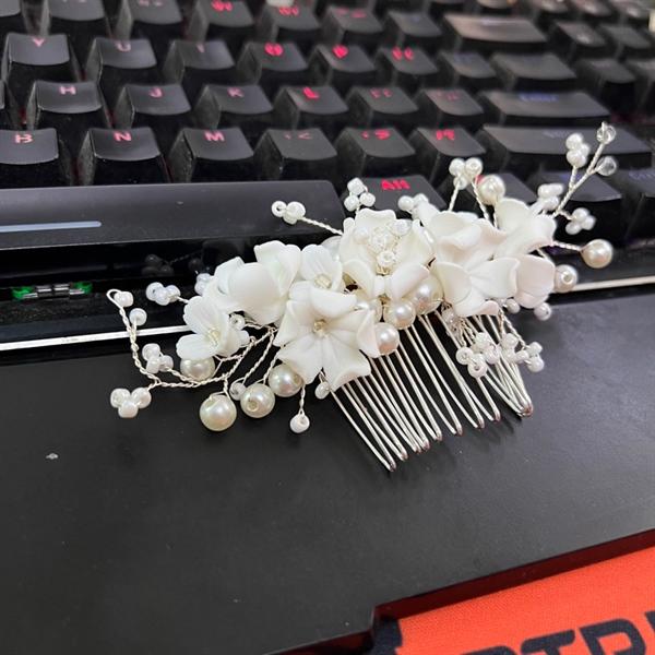 Trâm cài tóc cô dâu thiết kế ngọc trai và hoa 5 canh mềm mại, nữ tính. Tôn lên vẻ đẹp cho mái tóc xinh. Thích hợp trang điểm, make up cô dâu, trang điểm