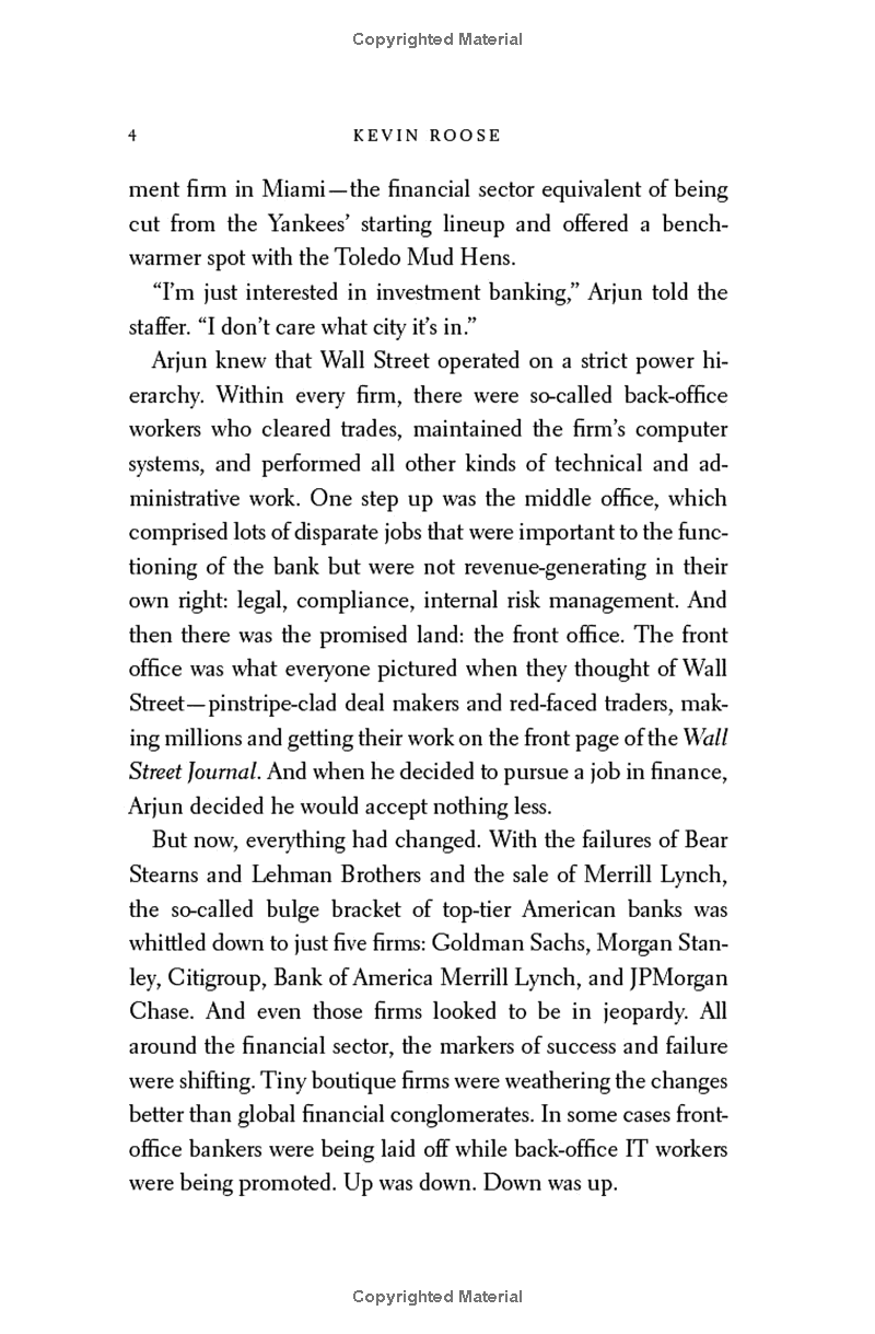 Roose's young bankers are exposed to the exhausting workloads, huge bonuses, and recreational drugs that have always characterized Wall Street life. But they experience something new, too: an industry forever changed by the massive financial collapse of 2008. And as they get their Wall Street educations, they face hard questions about morality, prestige, and the value of their work.